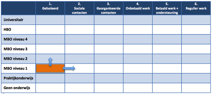 In deze matrix kan elke beweging, zowel naar rechts (grotere mate van zelfstandigheid, meer kans op loonwaarde), als naar boven (hoger opleiding niveau, vakkennis) inzichtelijk gemaakt worden, elke stap wordt als PBE (Participatie Beweging Eenheid) geregistreerd. Des te meer PBE’s, des te meer ontwikkeling, des te meer kans om aan het participatieproces deel te nemen, des te meer feestjes om te vieren.